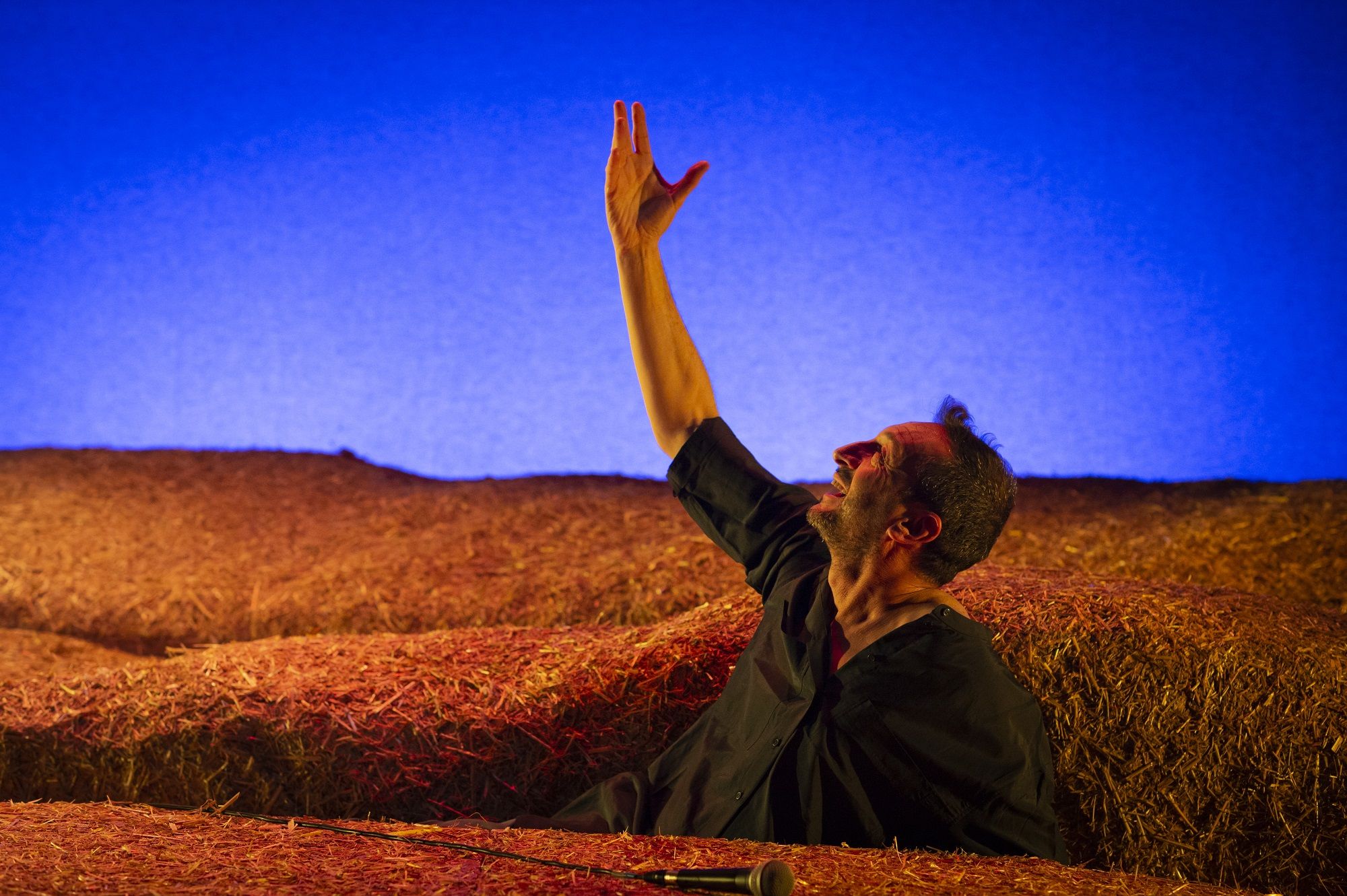 Mentre il pubblico entra in sala si sentono rumori di vento, di campagna. Si abbassano le luci, il palco diventa un insieme astratto di colori, di luci e di contrasti. In mezzo c’è lui, D’Elia, seduto su una sedia con il microfono in mano: come spesso succede nei suoi monologhi, anche se esistono scene e luci (Chiara Salvucci e Christian Laface, assistente alla regia Sabrina De Vita), è lui, con la sua voce soprattutto, a movimentare l’intero spettacolo. Sorprendentemente, infatti, quando in scena da solo, D’Elia non necessiterebbe di altro che la sua voce. Perché tanti sono i ritmi, le oscillazioni e gli umori che trasmette: il suo stesso entusiasmo e la sua energia sono trascinanti. Esercizi di memoria giornalieri, per tenere a mente tutti gli spettacoli che contemporaneamente porta in scena nei vari teatri di tutt’Italia, ieri neanche una sbavatura per Van Gogh. Forse, a volte, un filo di stanchezza appena percettibile per chi lo ha visto in scena innumerevoli volte. Molta poesia, comunque, nel dipingere la necessità fisiologica di colore, di ambienti aperti, di vita, dell’artista: “io non disegno le forme, ma vorrei disegnare le anime”. E il ruolo di Theo, il fratello, che lo aiuta, lo ascolta, lo sostiene quanto possibile. Finchè Van Gogh non arriva al taglio dell’orecchio: già si era sparato in una delle sue lunghe e quotidiane lunghe passeggiate in campagna, e Theo era venuto a soccorrerlo.