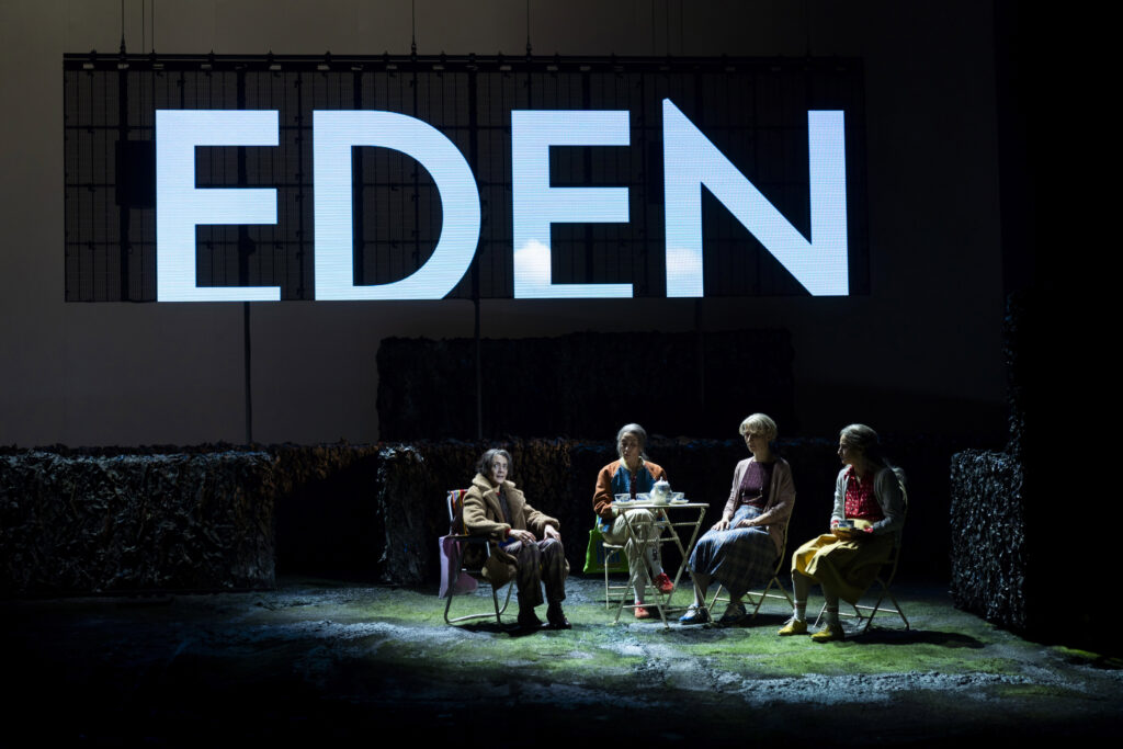 Il che, sostanzialmente, disturba e annoia, nonostante la scenografia vivace e l’aspetto simpatico delle quattro attrici. Qualunque argomento aperto arriva da nessuna parte: le protagoniste sono assorbite dal non luogo in cui si trovano, una specie di Truman Show con il megaschermo che proietta la scritta Eden o Longevity Program. Cantano i Nirvana sedendo di spalle al pubblico, non sembrano avere bisogni né desideri. Solo passano il tempo, senza porsi né sentire l’esigenza di avere domande.