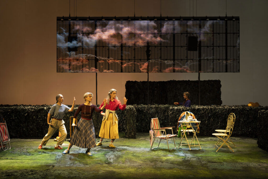 La scena, di Marco Rossi e Francesca Sgariboldi, è, anzitutto, sintetica: erba finta, cielo rappresentato da uno schermo che cambia immagine a seconda del momento della giornata, siepe anche sintetica. Sembra un set per una pubblicità. In questa finzione si gioca la apparente spontanea conversazione di un gruppo di quattro signore: Caterina Carpio, Tania Garribba, Arianna Gaudio e Alice Palazzi siedono insieme, o giocano a cricket, o bevono il tè, conversano, fanno ginnastica. Per un’ora il pubblico assiste al loro trascorrere del tempo, parlando di niente e senza scopo.