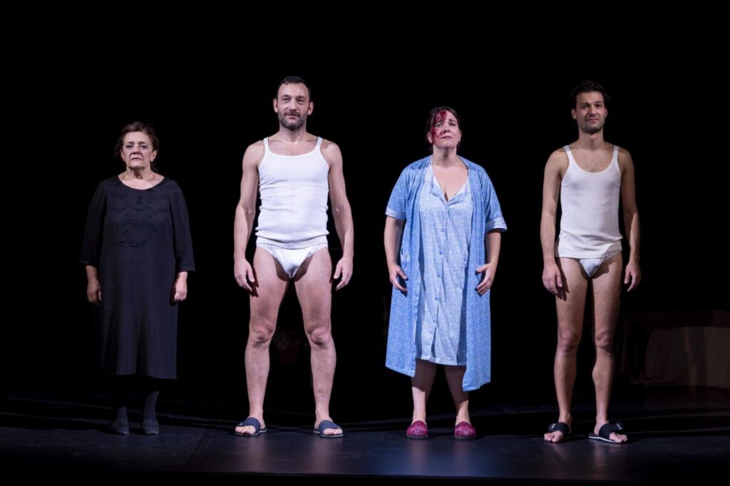 Ottimo il lavoro della regista con gli attori, sulla loro lingua e tutti i movimenti. Vite vicine, in poco spazio, in cui i corpi si urtano e si sopportano per poi esplodere. Giornate in cui la libertà individuale non è contemplata, eccetto che per il despota, il padre marito, che del resto non sa che farsene. Il tempo è, per tutti, inutile e incomprensibile. I quattro protagonisti si esprimono solo in dialetto, pugliese eccetto la suocera, Giuditta Perriera, “che parla un grammelot” dice la Dante (termine usato da Dario Fo per intendere una lingua che utilizza parole inventate, insensate, nuove, ma che a livello sonoro producono una sorta di senso). Parla al cuore, al cervello, all’anima: “la Perriera ha questa capacità straordinaria di usare il suo dialetto siciliano trasformandolo in una lingua magica. È incomprensibile, ma si capisce tutto: chi vede i miei spettacoli sa che non viene ad ascoltare l’italiano. C’è un groviglio di corpi e parole, e alla fine il pubblico capisce”. Certo, ci sono serate sottotitolate in italiano per favorire l’ascolto a chi ha difficoltà uditive e in inglese per avvantaggiare il pubblico straniero. Ed è vero che “anche gli italiani avrebbero bisogno dei sottotitoli” per avere chiara ogni parola usata, commenta la regista, ma è anche vero che le parole sono, in questo spettacolo, una musica che accompagna e sottolinea i movimenti degli attori aumentandone il senso. Che arriva, in modo intenso e reale come solo la finzione teatrale sa rendere.