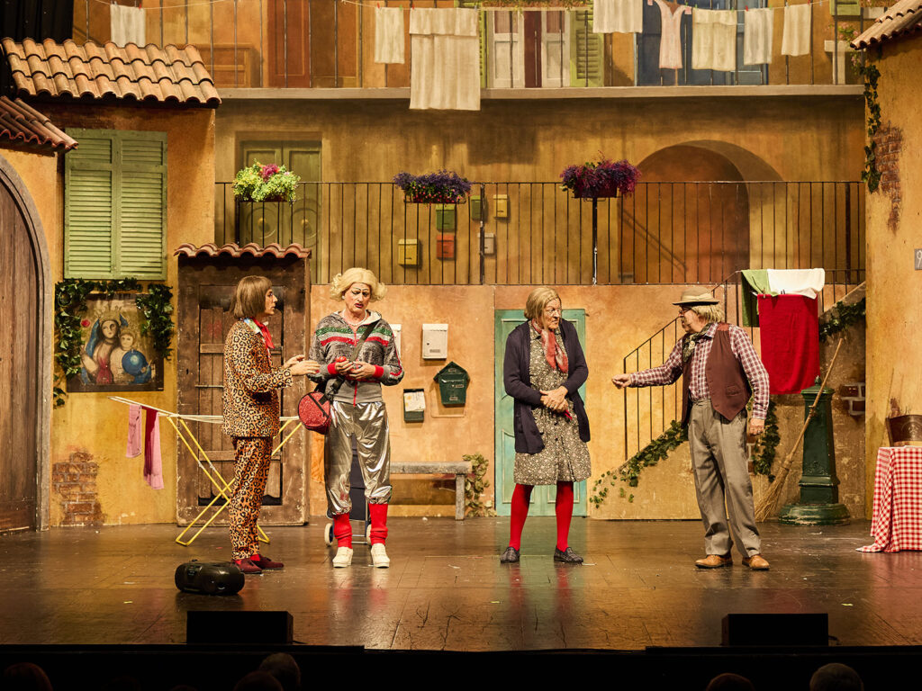 Alla base de I promossi sposi c’è il tema dell’amore che cambia e si trasforma nel tempo. Per citare Manzoni “il cuore è un guazzabuglio”, e vale anche per chi vive in una piccola comunità lombarda, di conoscenze strette. Siamo in un cortile di un gruppo di case di ringhiera: Giovanni, Italo Giglioli, il marito, comunica alla moglie Teresa, Antonio Provasio, e alla figlia Mabilia, Enrico Dalceri, che ha scoperto che per un errore del Comune lui e Teresa non sarebbero mai stati sposati.