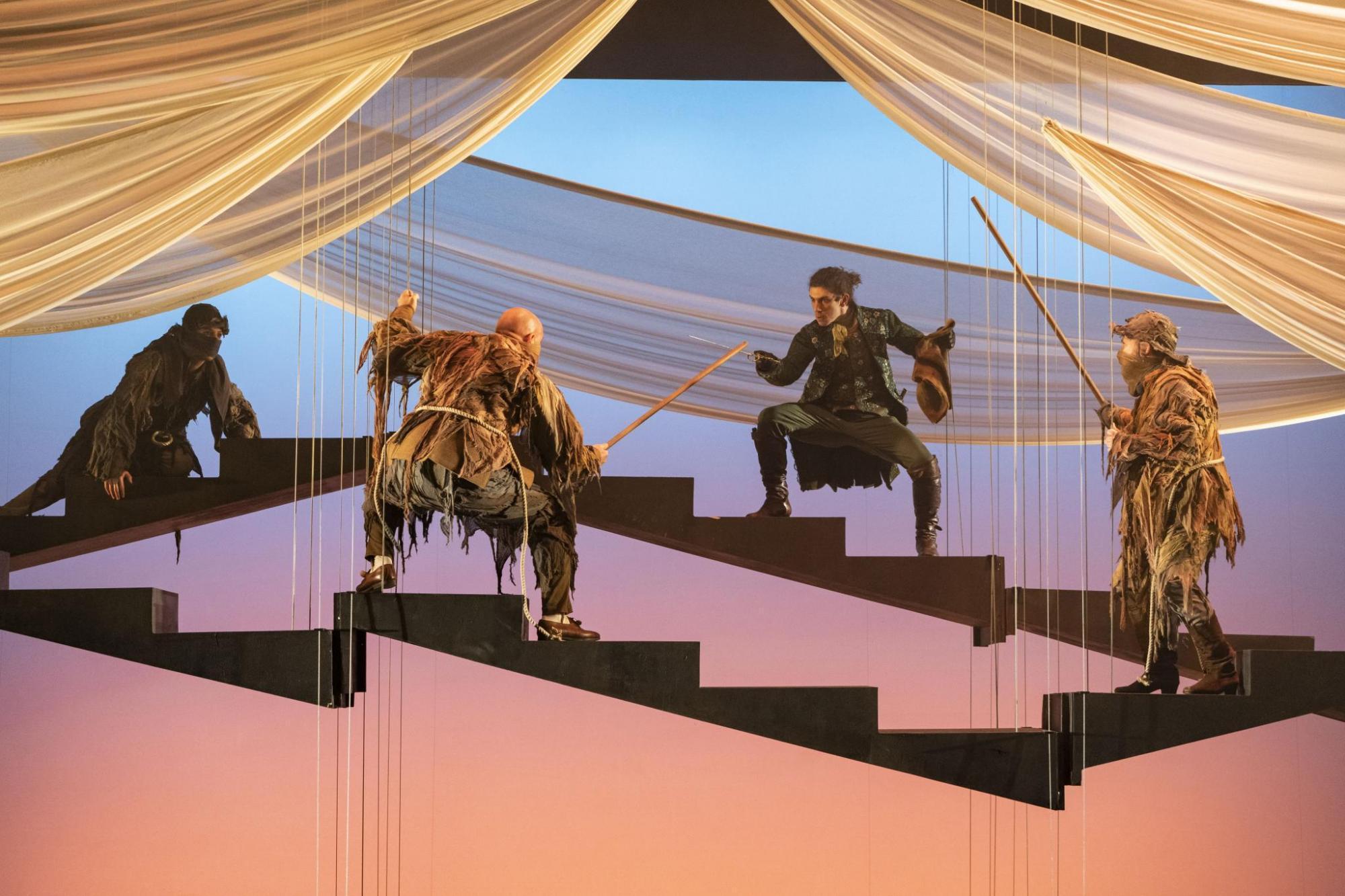 Una prima scena che dura parecchio, portando fin da subito gli spettatori a capire che il contesto è quello della fantasia: bisogna entrare nella parte, abbandonarsi al gioco e al ritmo che propone il palcoscenico. E presto non si riuscirà a staccare gli occhi, l’animo e il cervello da ciò che sta avvenendo in scena. Cosimo è sempre più convinto a trasferirsi nel bosco. Aldilà della sua vita tra le piante, che viene descritta e realizzata in modo simbolico ma chiaro e coinvolgente grazie alla scenografia di rami/scale sospesi e grandi vele/nuvole, ciò a cui porta il cambio di parametro che il barone rampante propone a tutta la sua famiglia è il fulcro dello spettacolo.