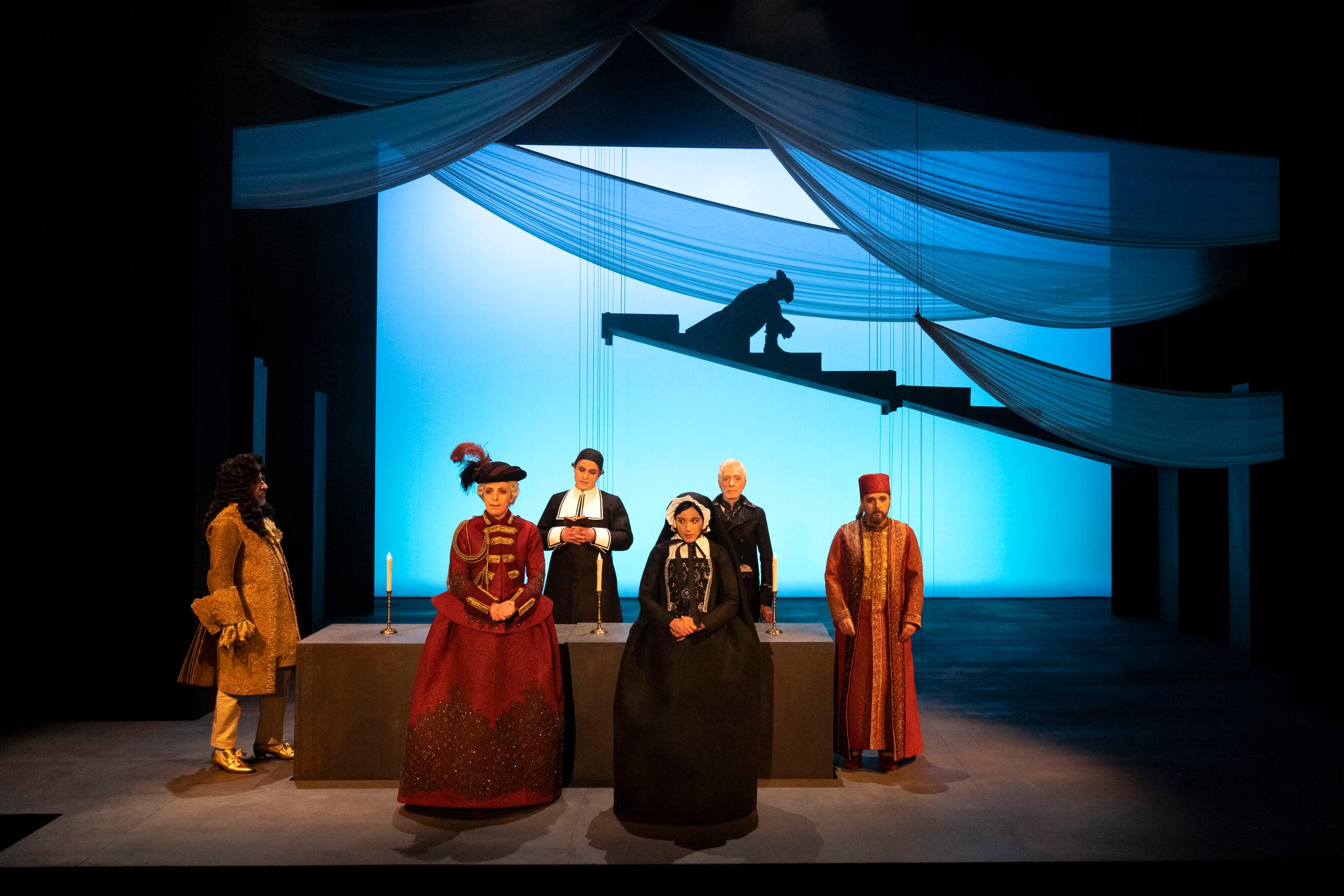 Ecco perché vedere questa seconda produzione del Piccolo per il 2023 porta gli spettatori a entrare nella scena, come quando si è divorati dalle pagine di un libro che ci coinvolge, in questo caso per la sua delicatezza e profondità insieme. La scena si apre su una tavola vuota. Piano piano entrano i commensali, con i loro ricchi costumi. Siamo nel 1767, epoca in cui Calvino ambientò il suo Barone Rampante: il Barone Arminio, (Mauro Avogadro che interpreterà numerose altre parti minori nel corso dello spettacolo, come anche tutti gli altri attori), Cosimo Piovasco di Rondò, figlio del Barone di Rondò nonché riverito signore di Ombrosa (il protagonista, Francesco Santagada), Biagio, il fratello del protagonista (interpretato da Giovanni Battaglia), il Cavaliere Avvocato (Nicola Bortolotti), l’Abate (Michele dell’Utri), e la madre Generalessa (Diana Manea). Cosimo, dodicenne all’inizio del racconto, si rifiuta di mangiare le lumache scatenando l’ira del padre e della madre: scappa rifugiandosi in giardino sugli alberi. Da qui non scenderà più.