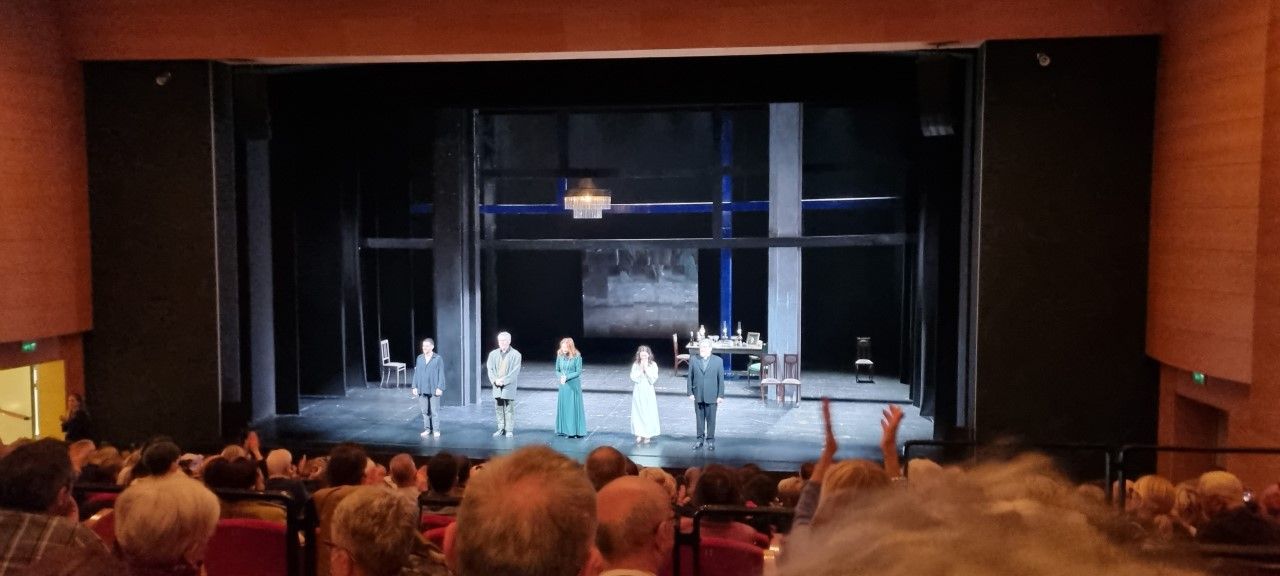 La sera successiva, sabato, ci siamo trovati al Teatro dell’Elfo: qui l’aperitivo è stato a scelta individuale, non tutti lo hanno voluto, e, anche qui, nel bar del Teatro, Olinda. Propone diverse combinazioni e piatti, oppure anche solo la possibilità di prendere una consumazione con salatini e patatine. La platea era piena, e a fine spettacolo ci sono stati almeno 10 minuti di applausi: il pubblico era colpito e affascinato, in particolare dalla bravura della Jonasson, ma non solo: era unanime il gradimento per tutti i componenti della compagnia. Che, in una scena di pochi elementi, restituisce tutta la tumultuosità degli stati d’animo di ogni personaggio, soffocata e nascosta in un dolore apparentemente silenzioso.